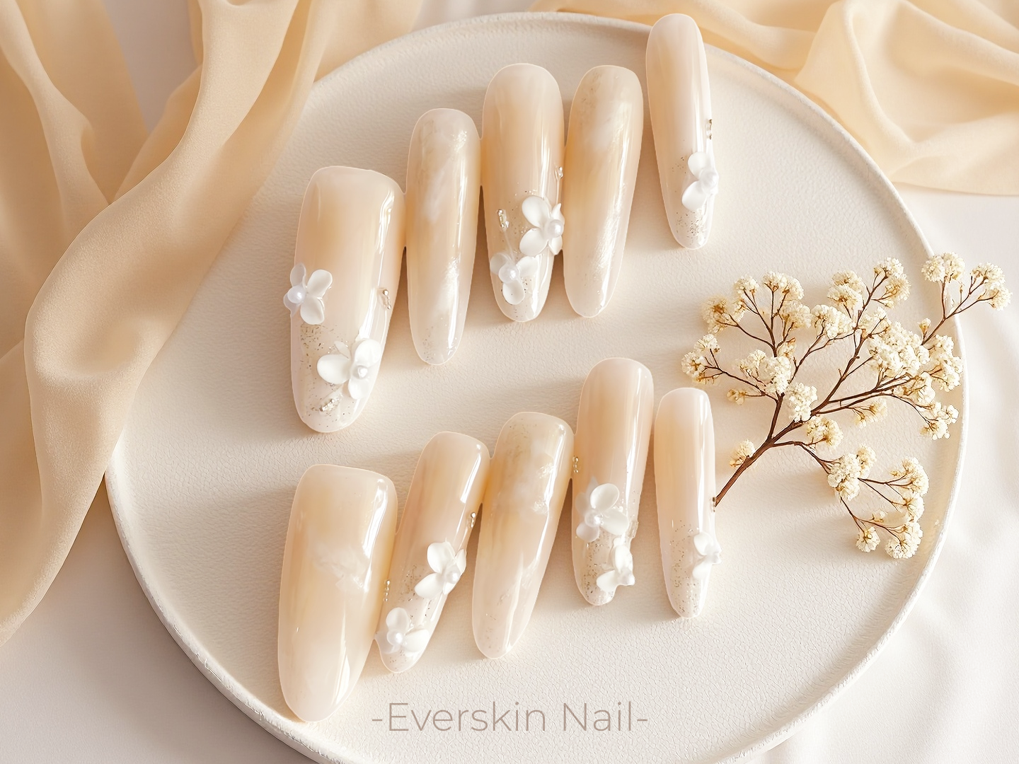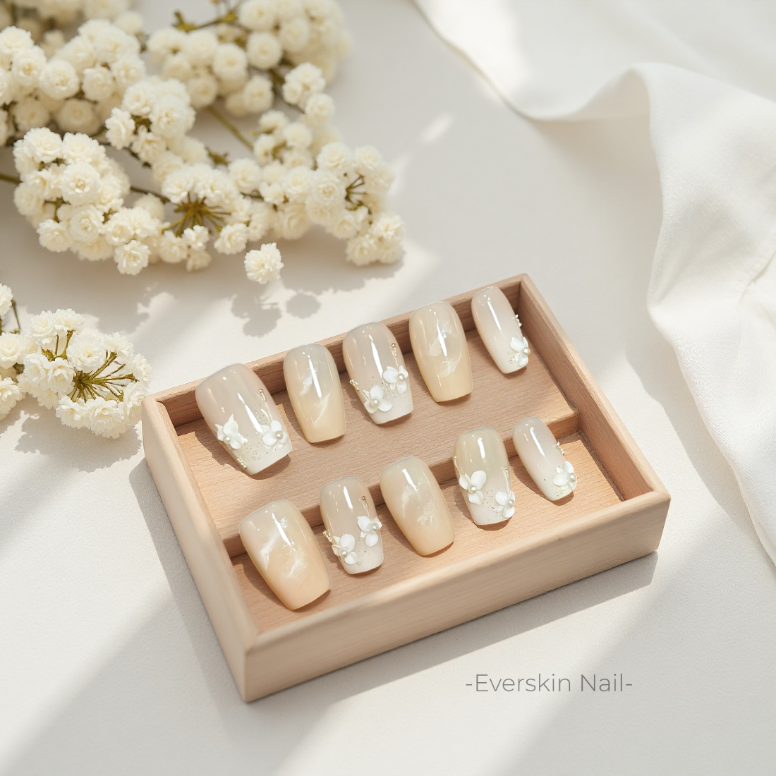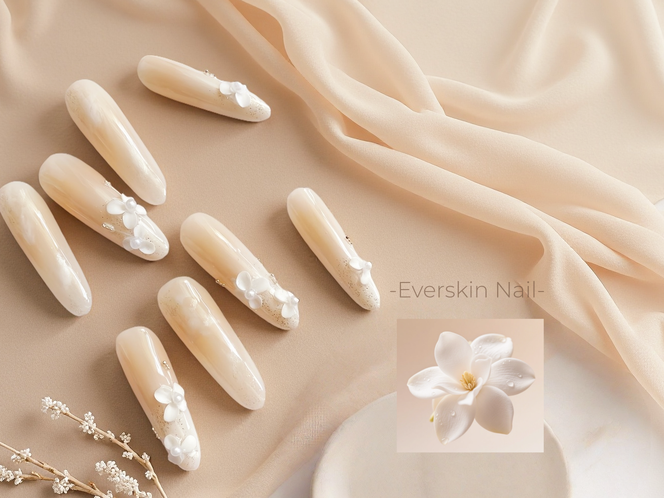 「這款穿戴甲以淺米色為底色搭配暈染效果,再點綴白色立體梔子花、細閃與小珍珠,清新雅致。