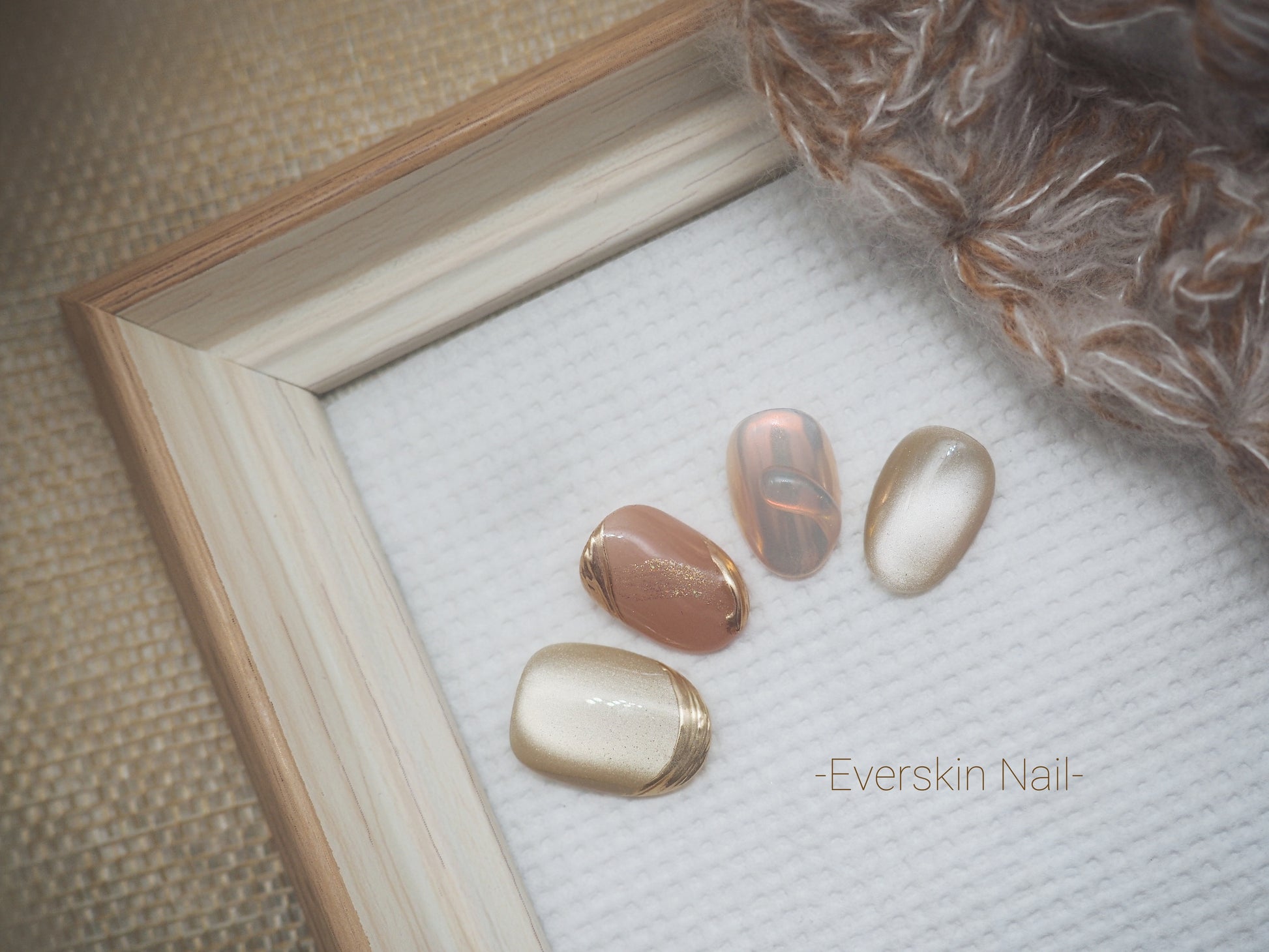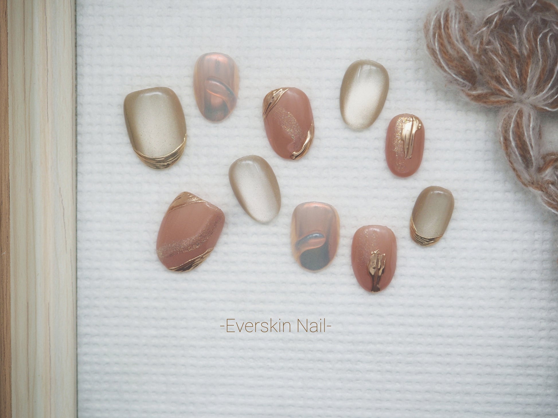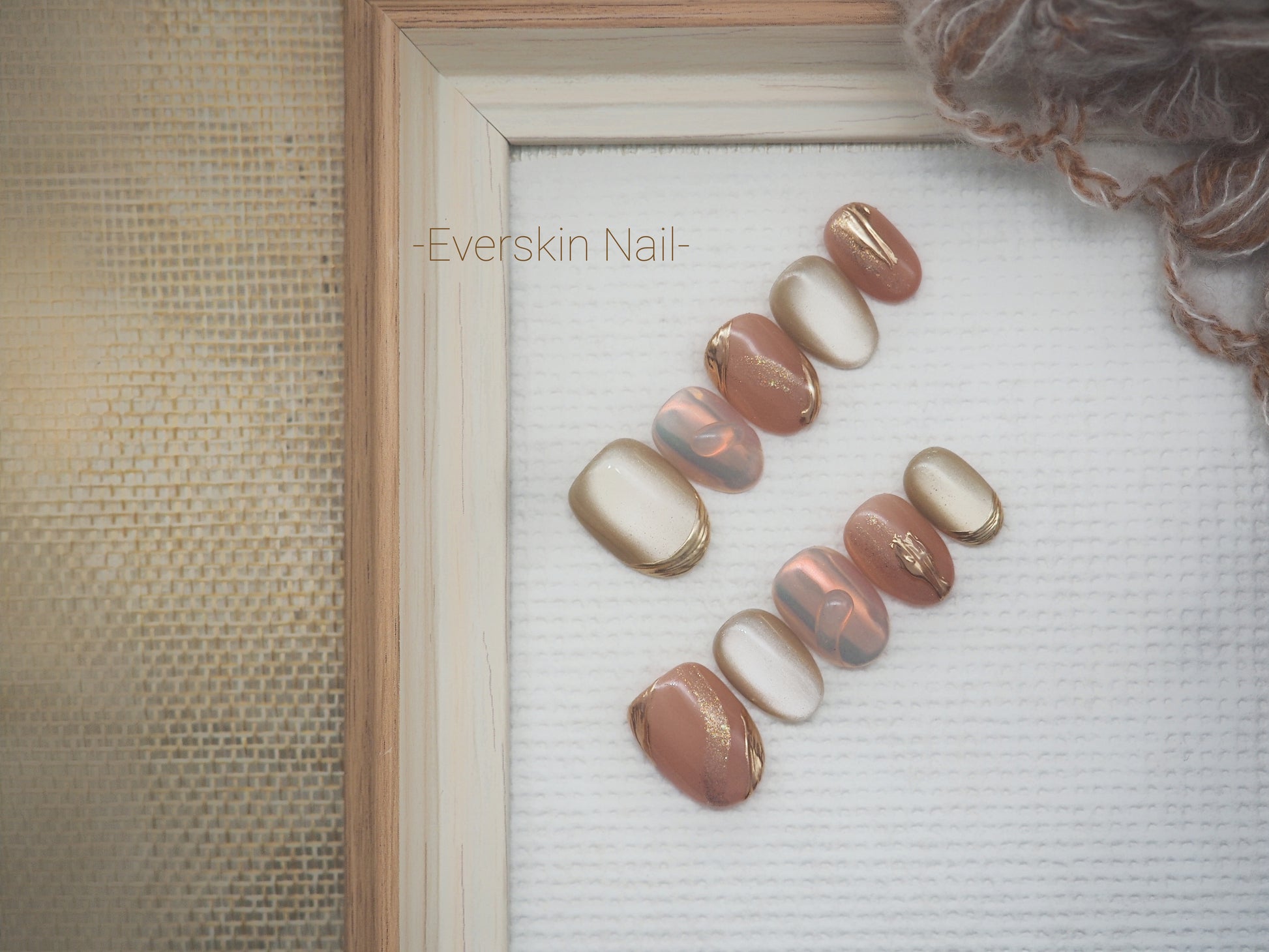 粉金撞色穿戴甲,貓眼+金屬質感,適合輕奢約會、日常配襯 。
