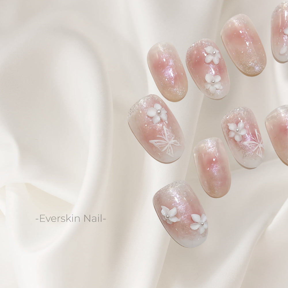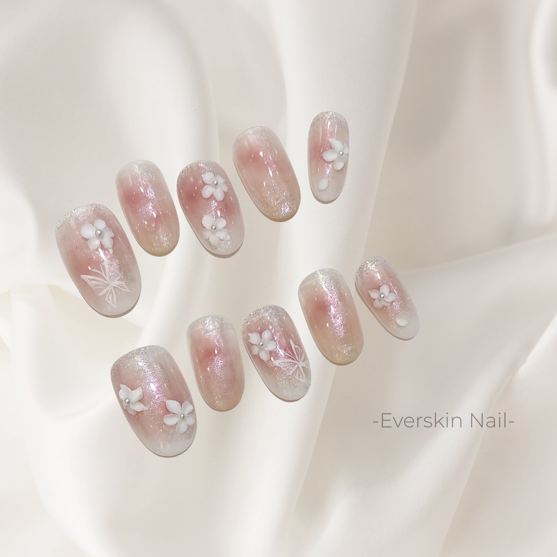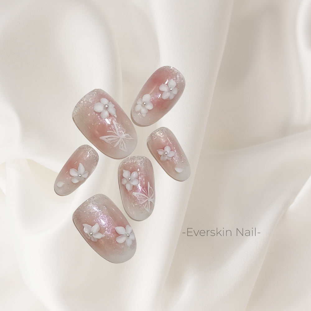 「淡粉色系暈染自然柔和,再點綴純手工製作的精緻雕花,每一朵都是獨一無二的。不管日常還是約會都很適合~」